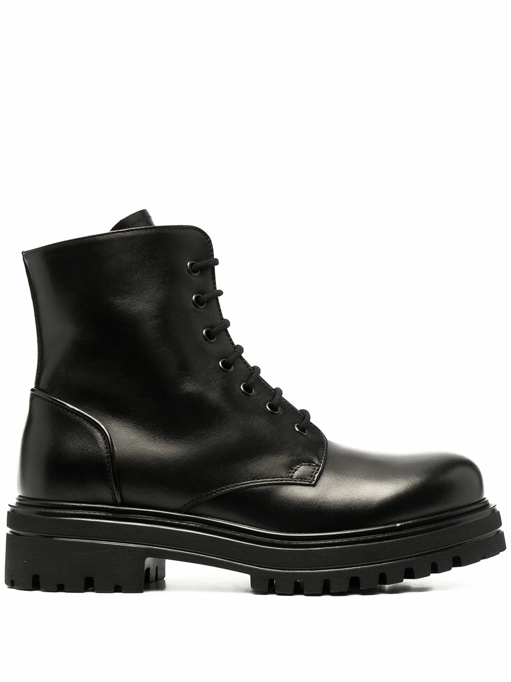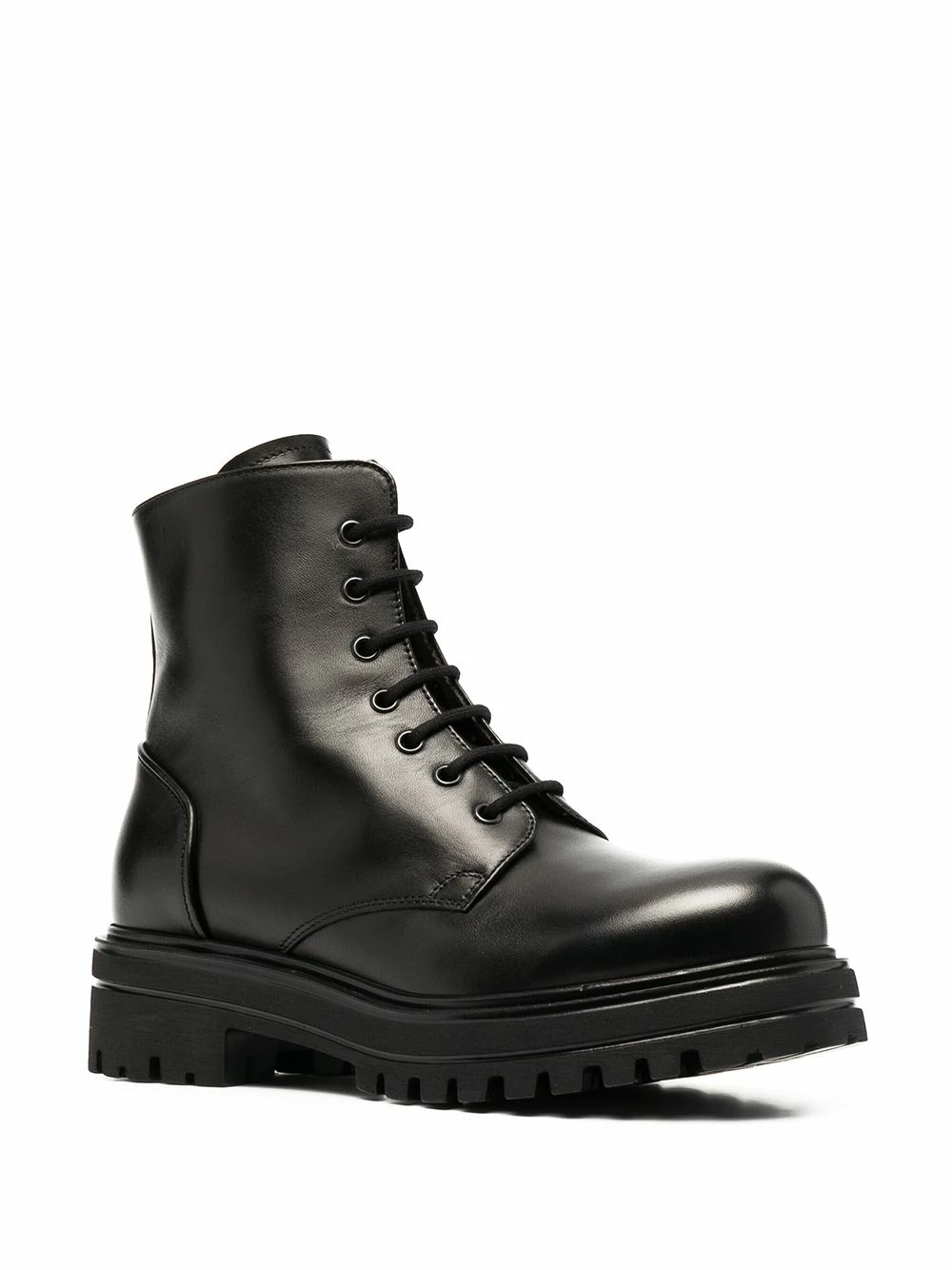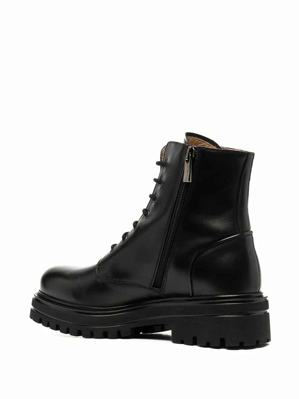 Fermeture à lacer sur le devant, fermeture zippée sur les côtés, bout rond, semelle épaisse en caoutchouc. Couleur : noir. Matière : cuir.
