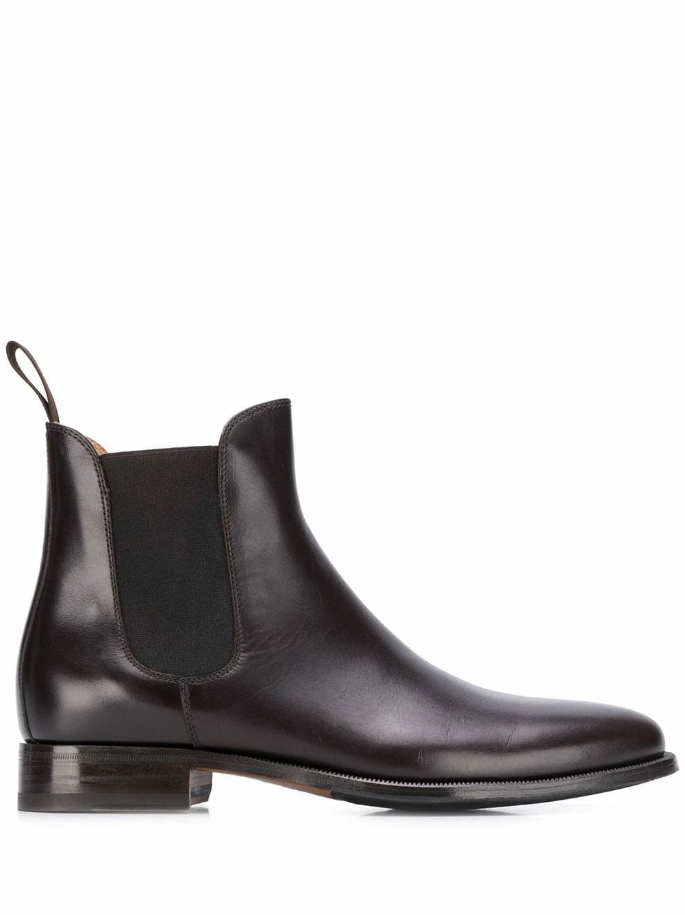 Bottines chelsea à bout pointu en cuir de veau Scarosso avec bout en amande, petit talon épais, hauteur cheville, empiècements élastiqués sur les côtés et languette arrière.