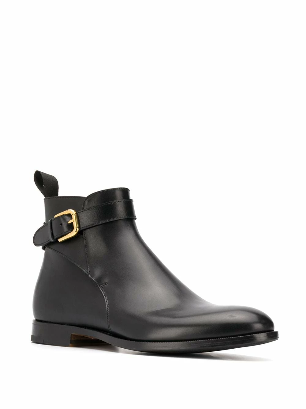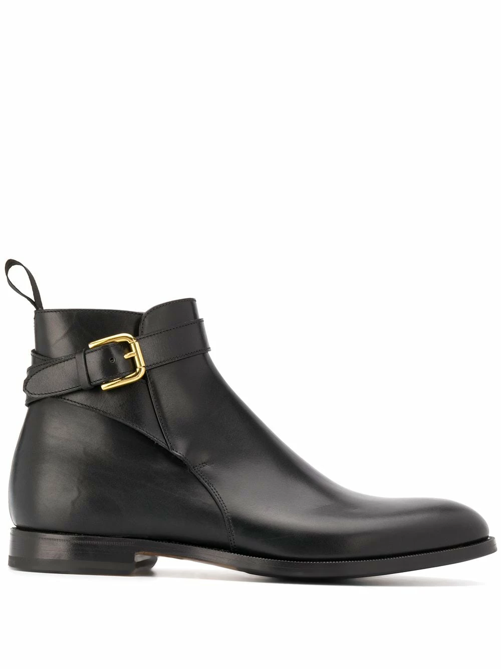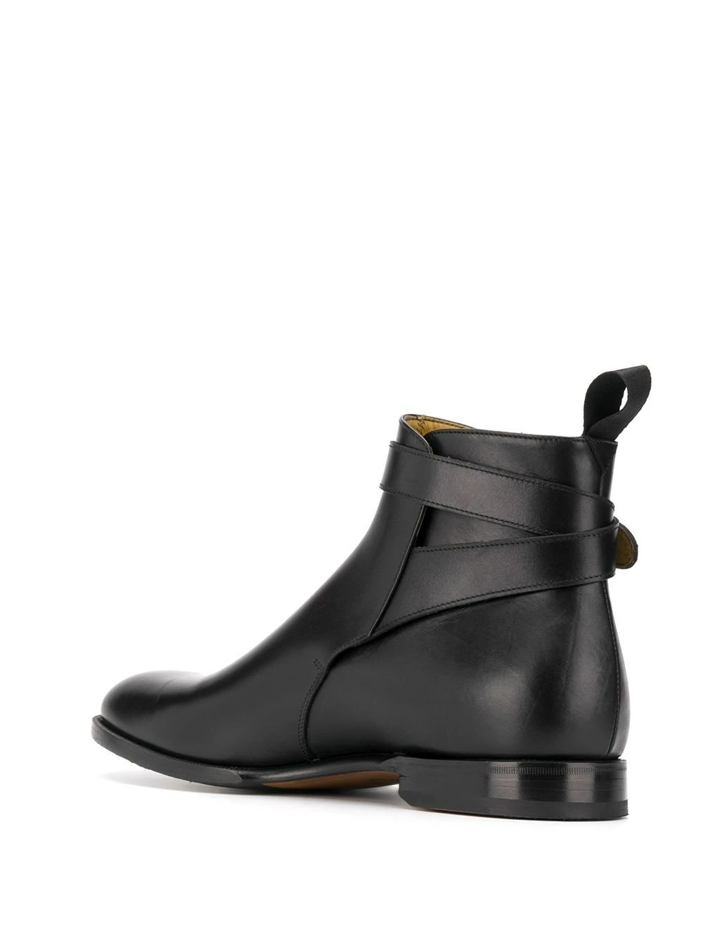 Bottines à détail de sangle Taylor en cuir Scarosso avec détails dorés, bout en amande, languette arrière, semelle plate et petit talon. Couleur : noir.