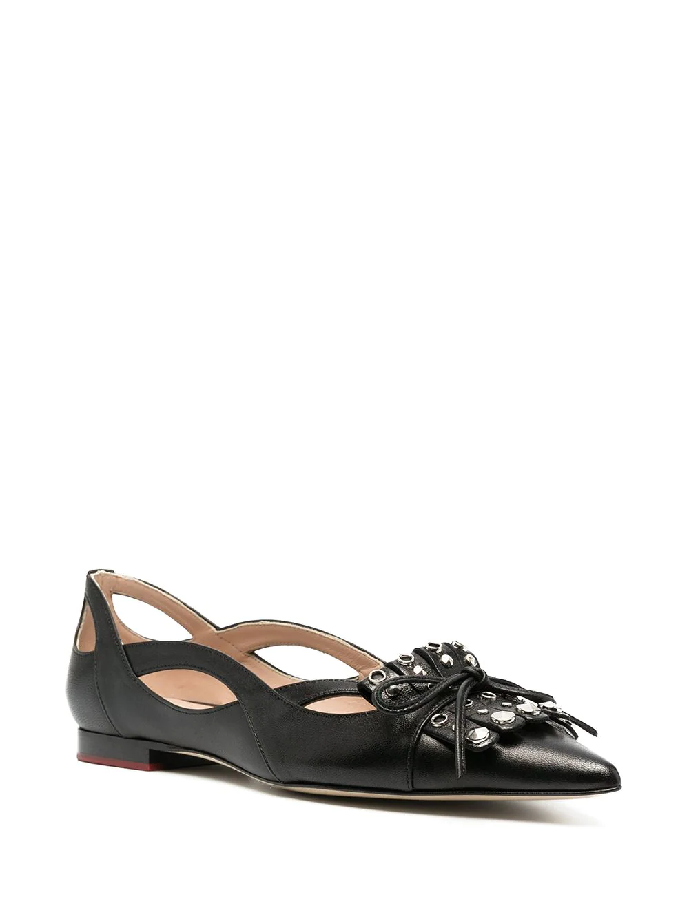 Détails de découpes, bordures à détails de clous, bout pointu, semelle plate. Couleur : noir. Matière : cuir.