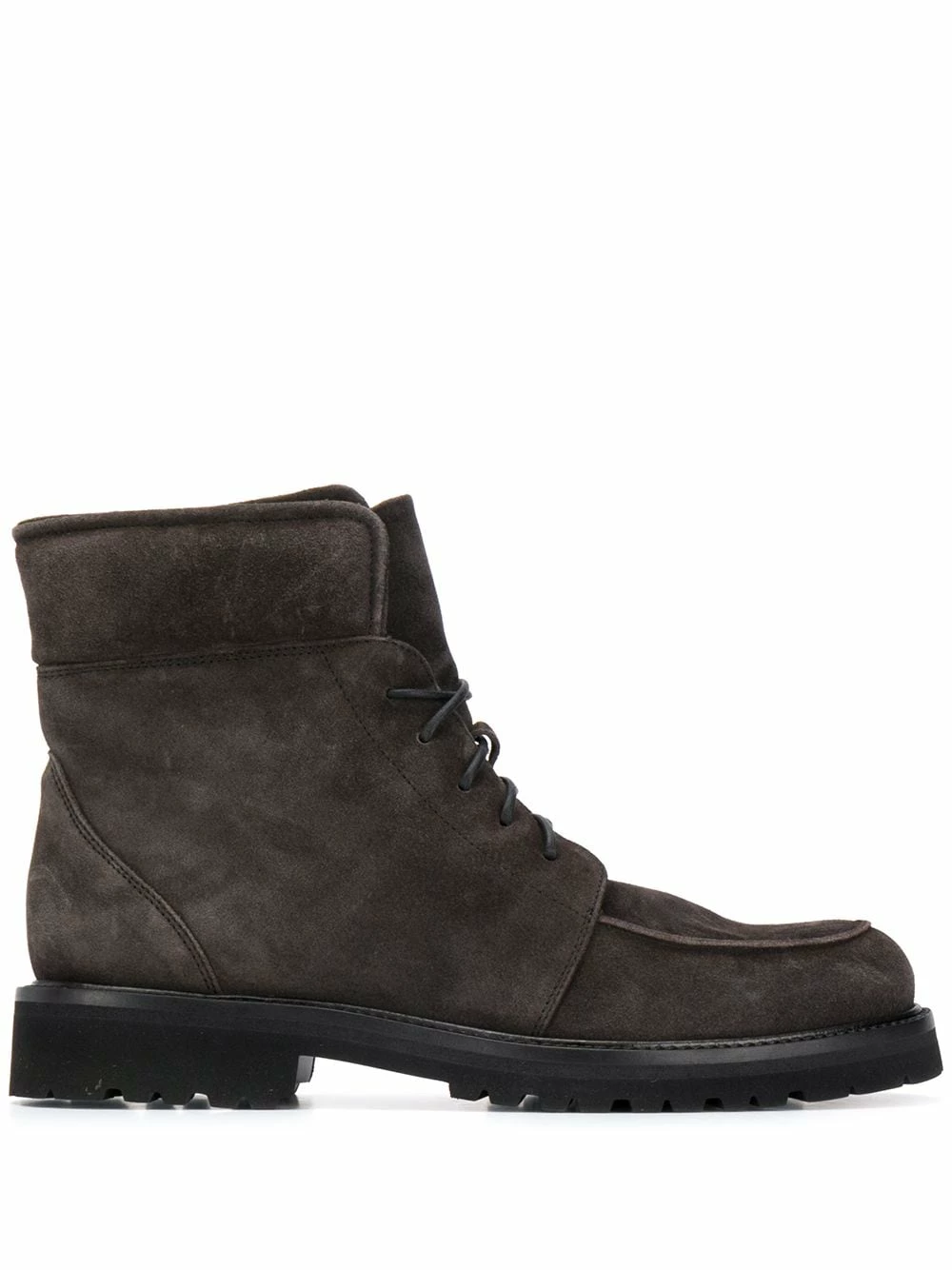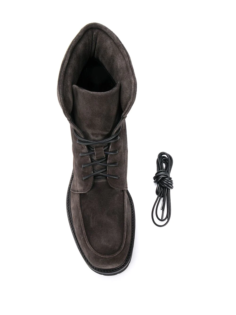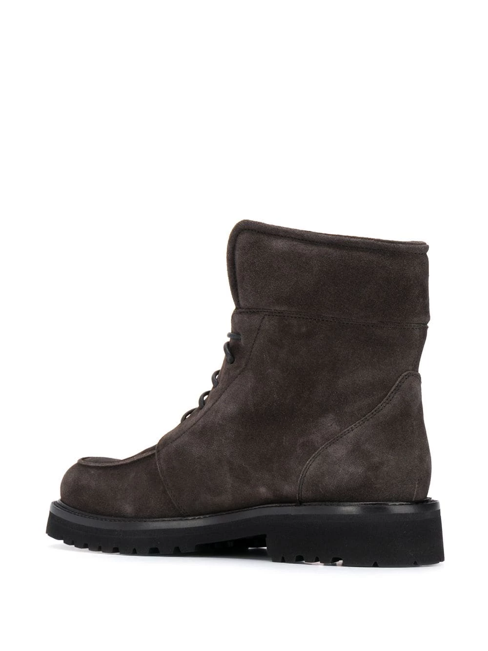 Chevilles rembourrées, fermeture à lacer sur le devant, semelle plate en caoutchouc, bout carré. Couleur : gris.