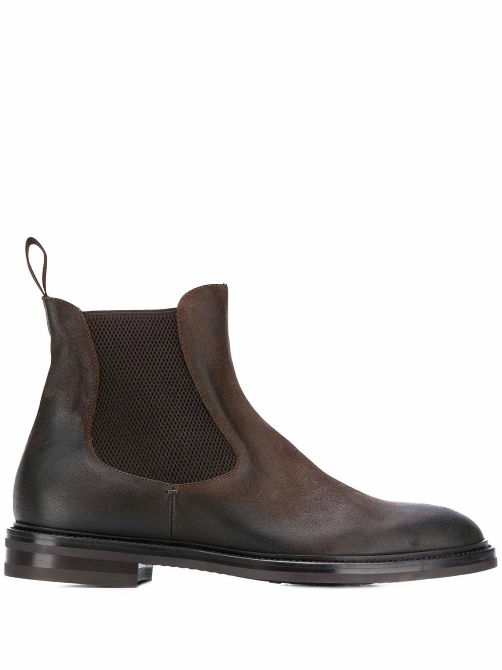Bottines chelsea à bout en amande en cuirs Scarosso avec bout rond, petit talon épais, empiècements élastiqués sur les côtés, hauteur cheville, languette arrière et effet délavé usé. Couleur : marron.