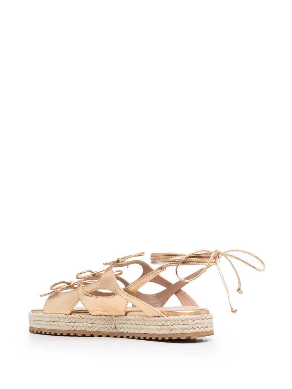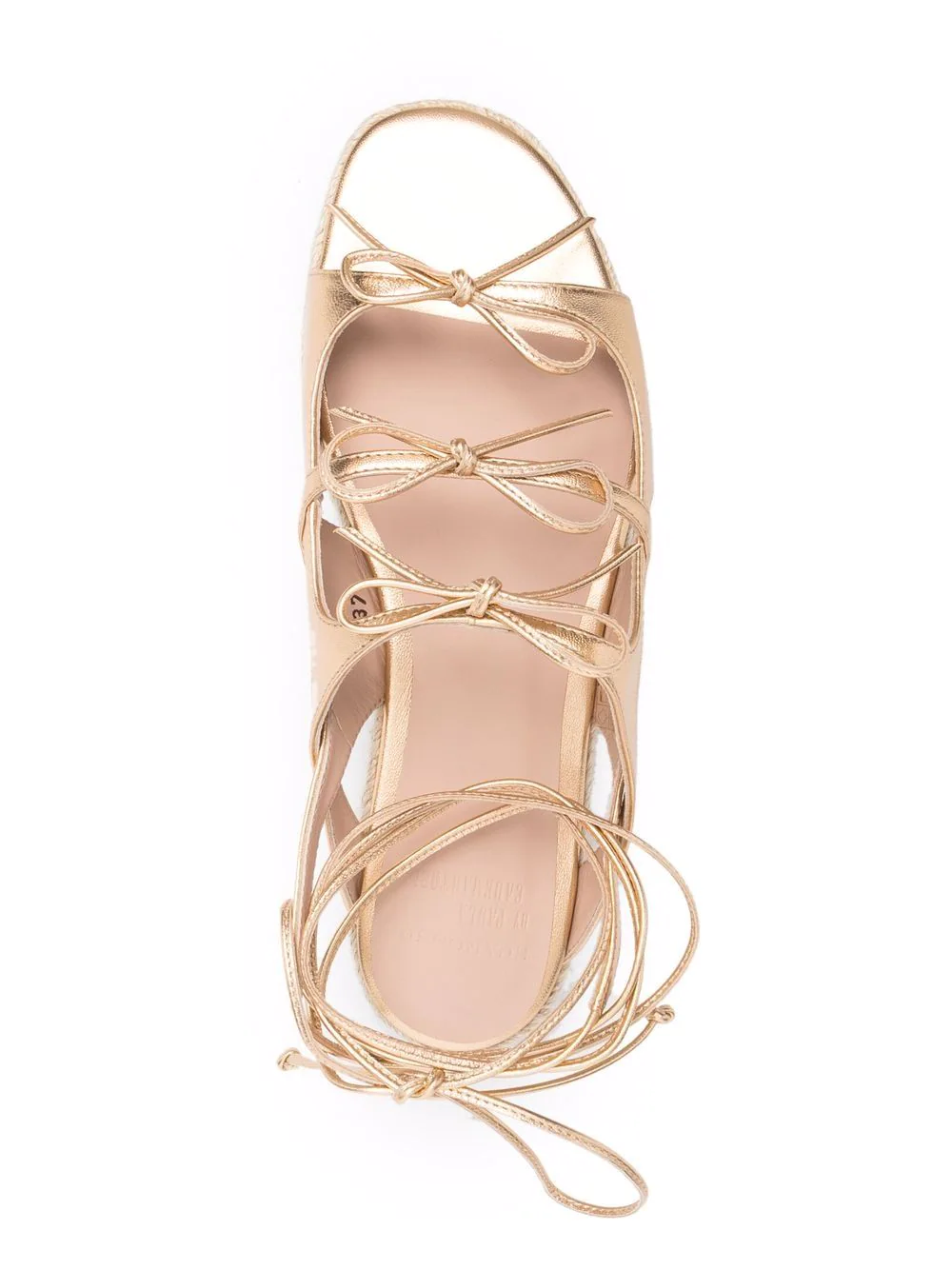Doublure en cuir, bout ouvert, détail de nœud, fermeture nouée au dos, semelle intérieure à logo, semelle en raphia tressé, semelle en caoutchouc.
