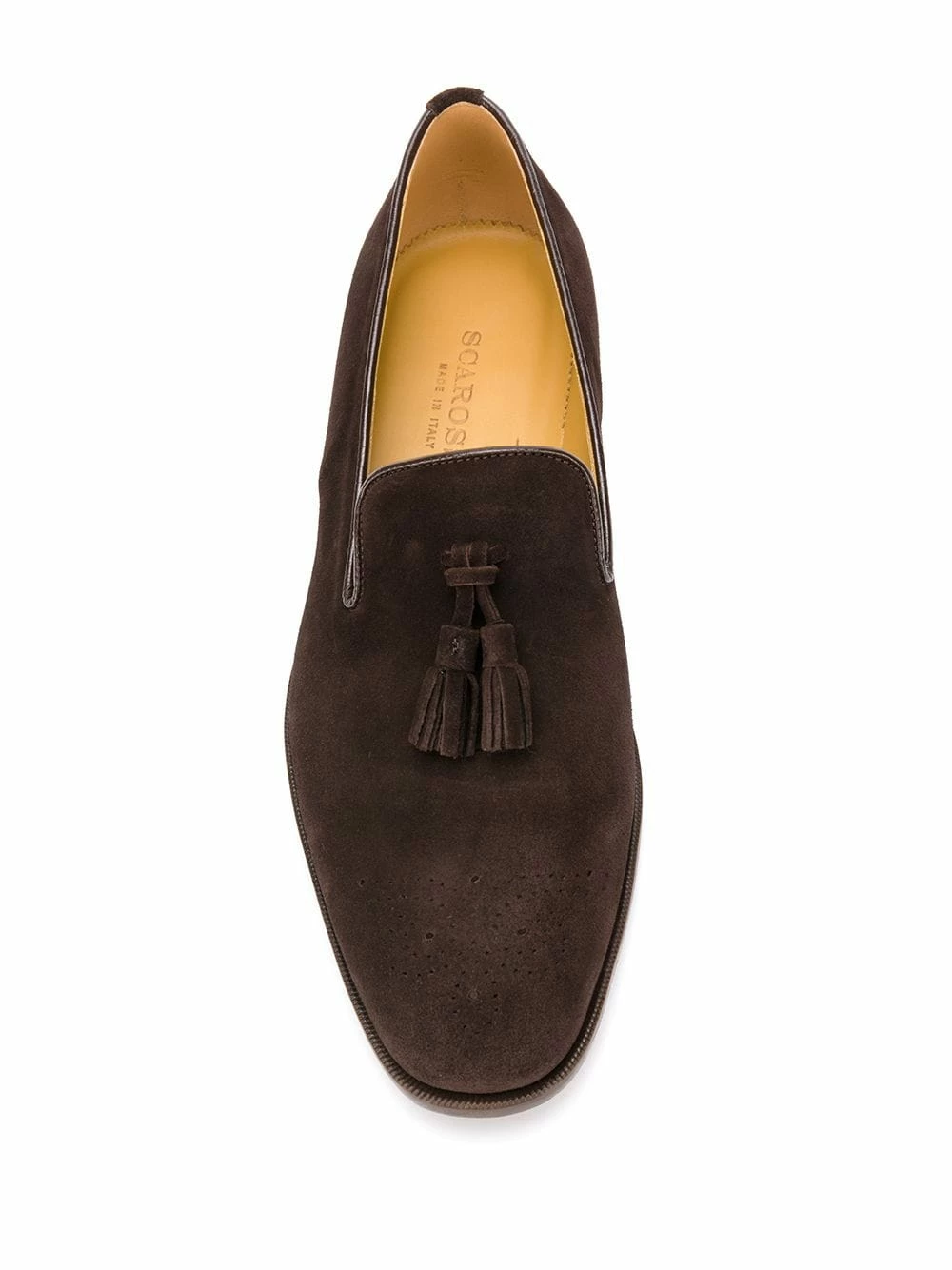 Mocassins à glands en daim Scarosso avec design à enfiler, semelle plate, semelle intérieure à logo et détail de pompon. Couleur : marron.