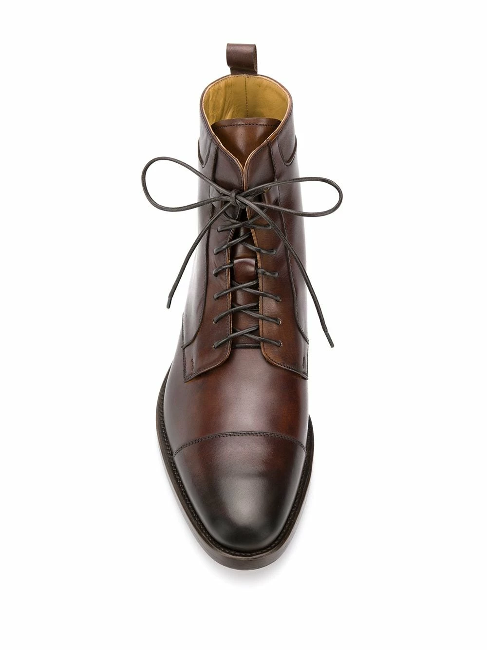 Bottines à lacets en cuirs Scarosso avec hauteur cheville, languette arrière, laçage sur le devant, détails façon richelieu, petit talon et bout pointu. Couleur : marron.