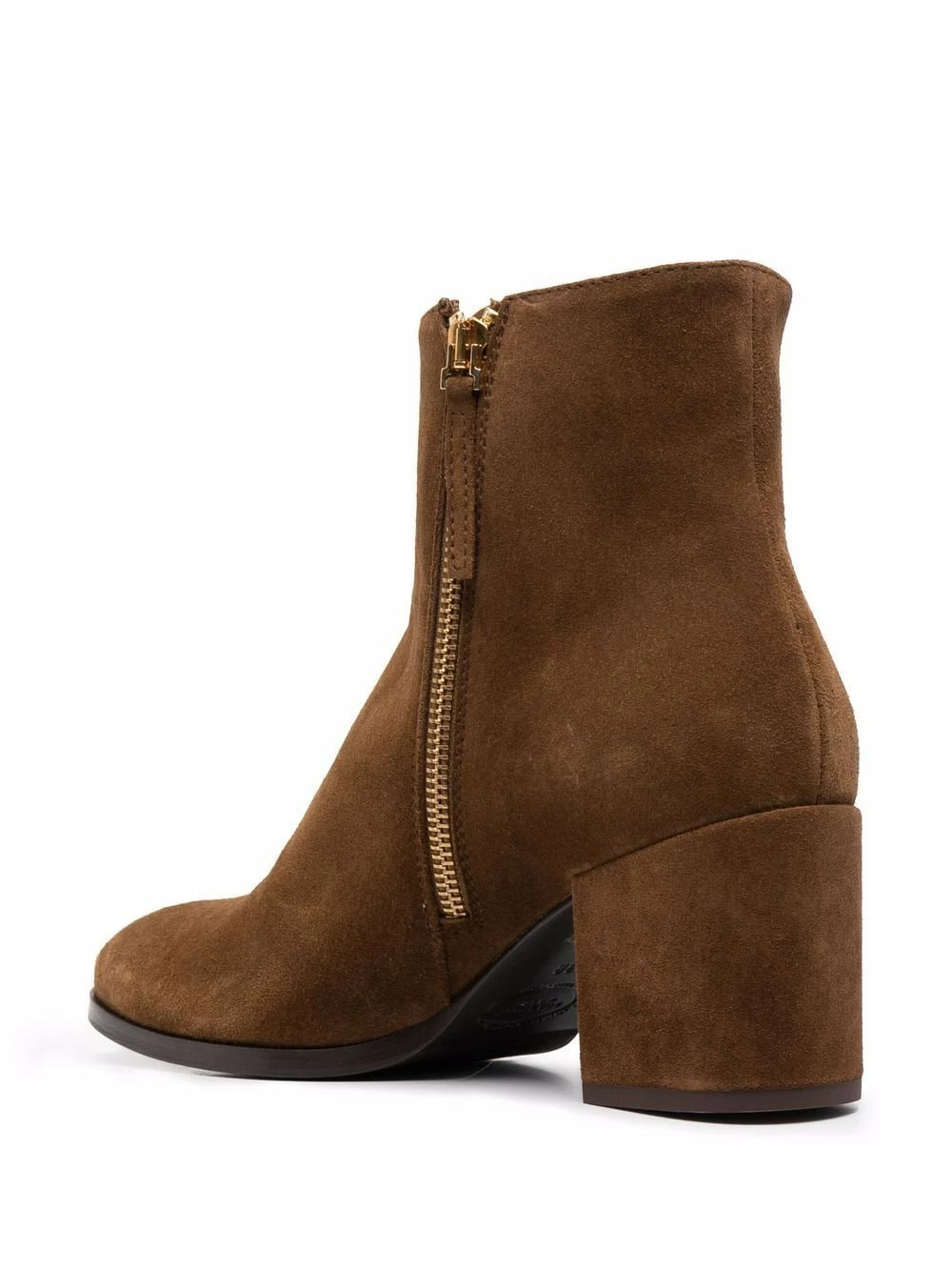 Fermeture zippée sur le côté, hauteur cheville, bout rond, petit talon épais. Matière : cuir.