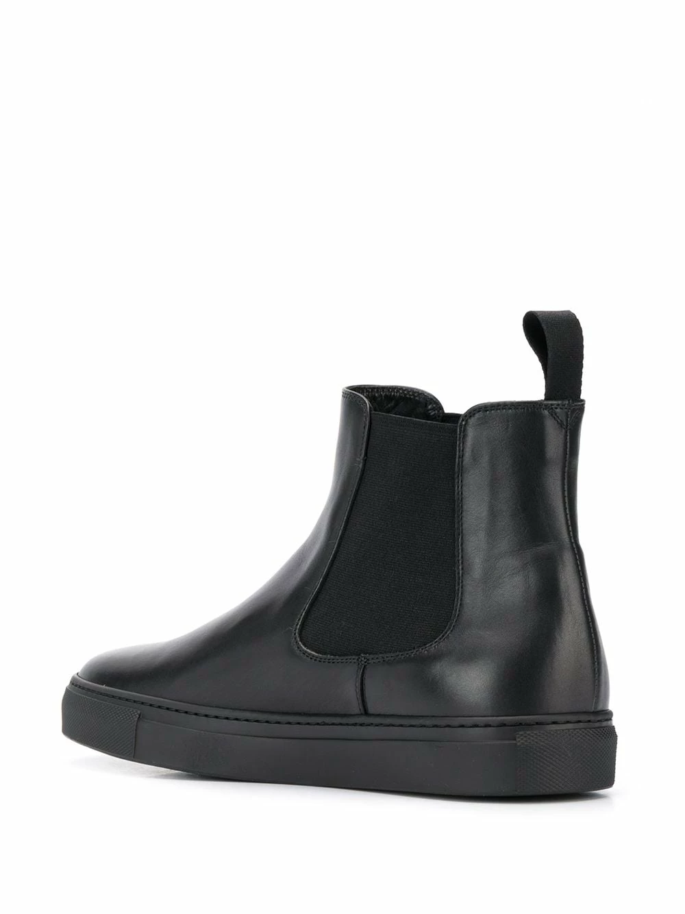 Bottines montantes en cuirs Scarosso avec languette arrière, empiècements élastiqués sur les côtés, bout en amande et semelle plate en caoutchouc. Couleur : noir.