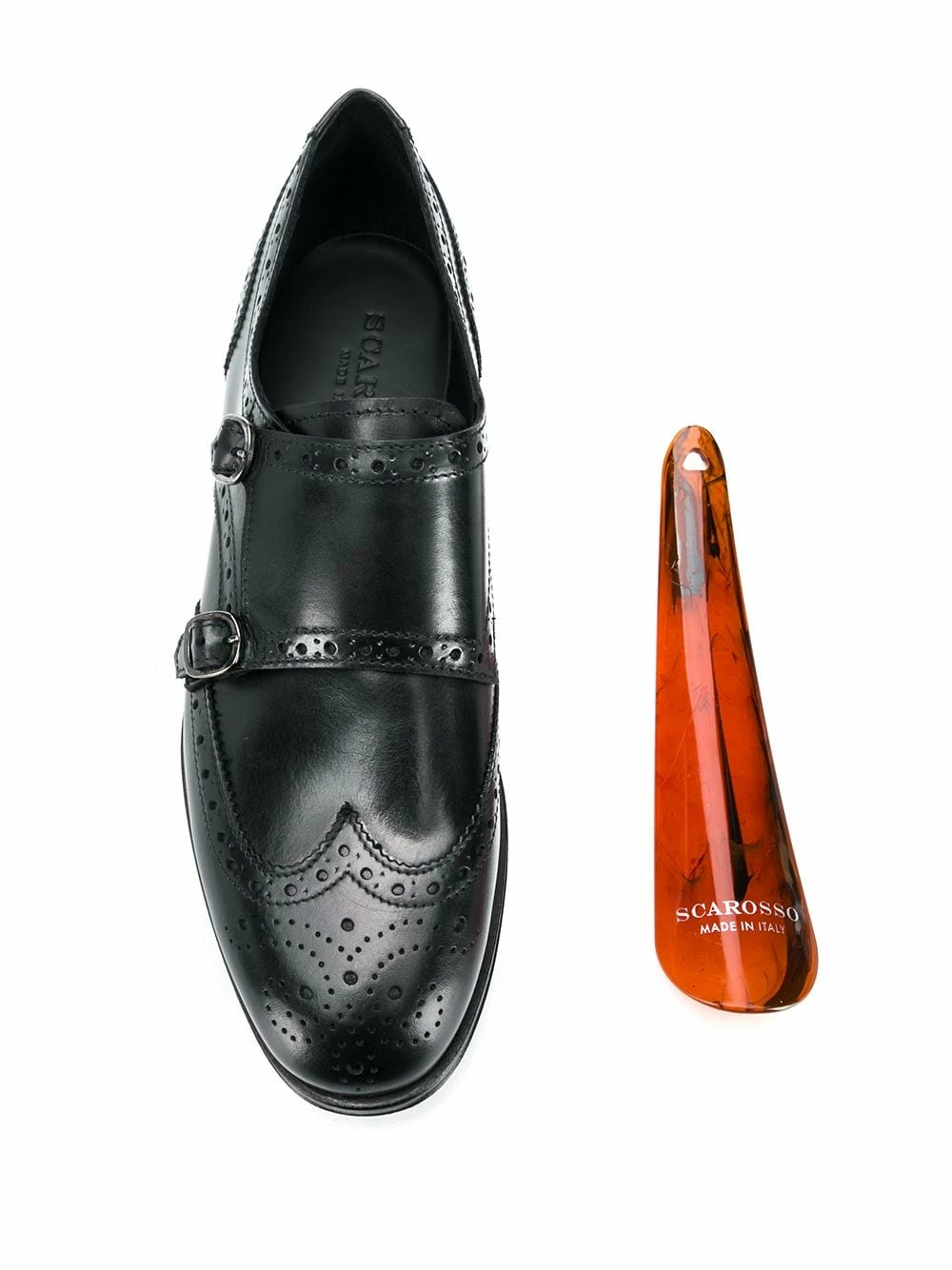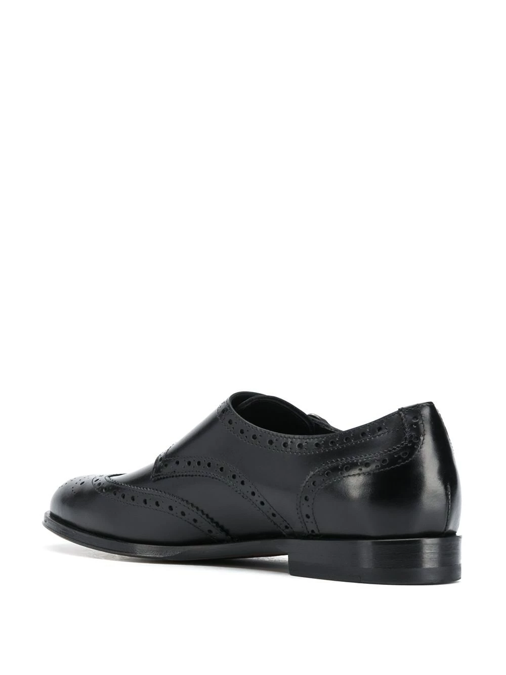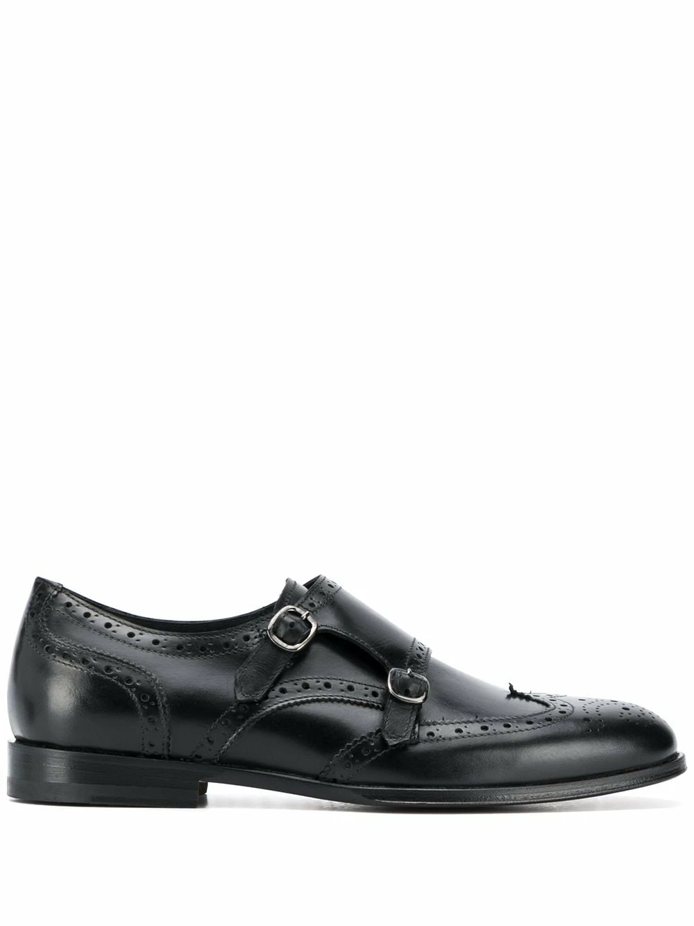 Ornements argentés, bout en amande, double boucle, finitions façon richelieu, semelle intérieure à logo, petit talon épais. Couleur : noir. Matière : cuir de veau.