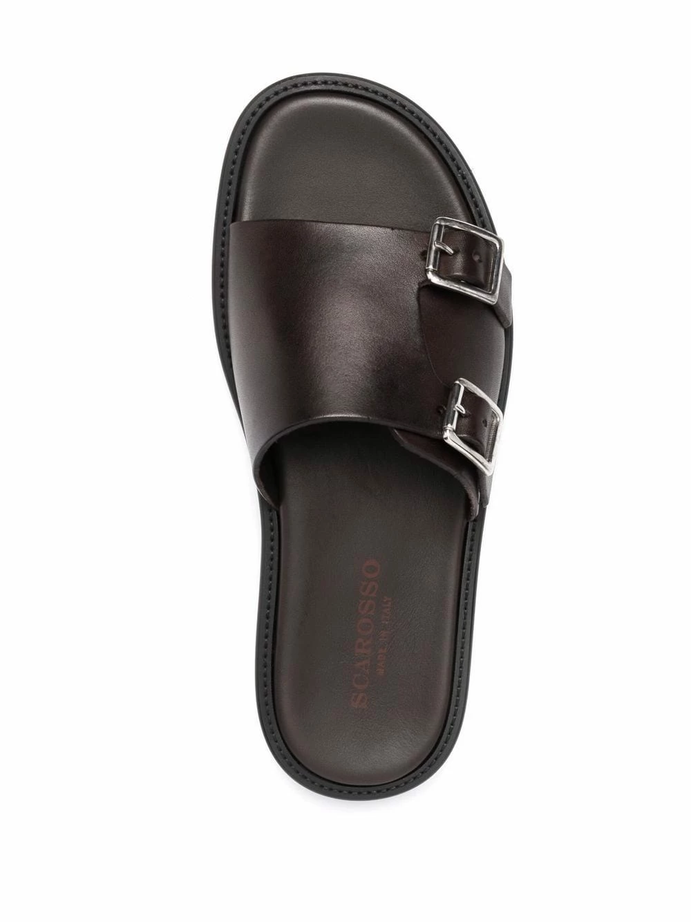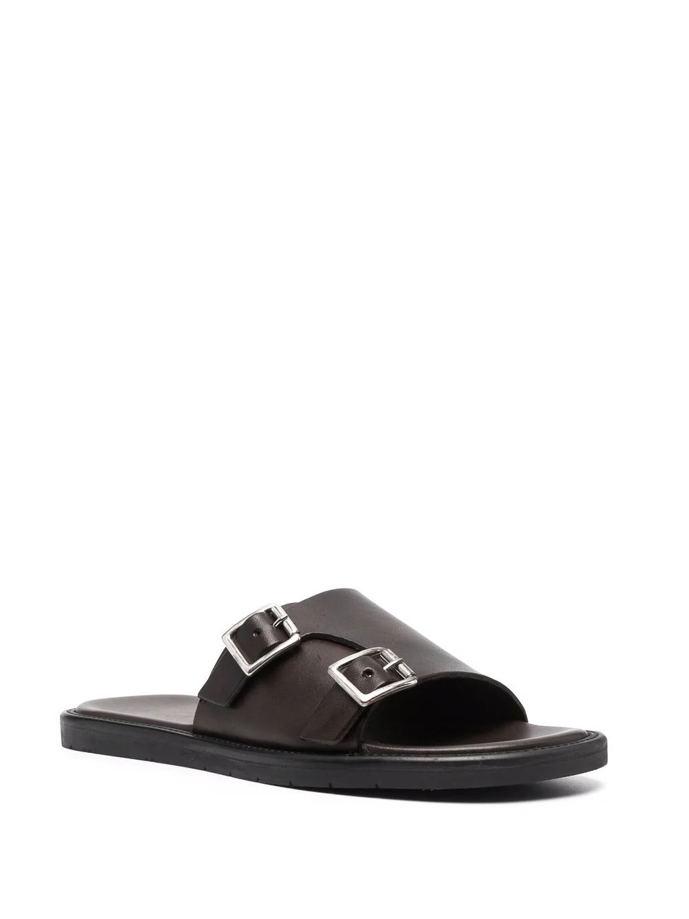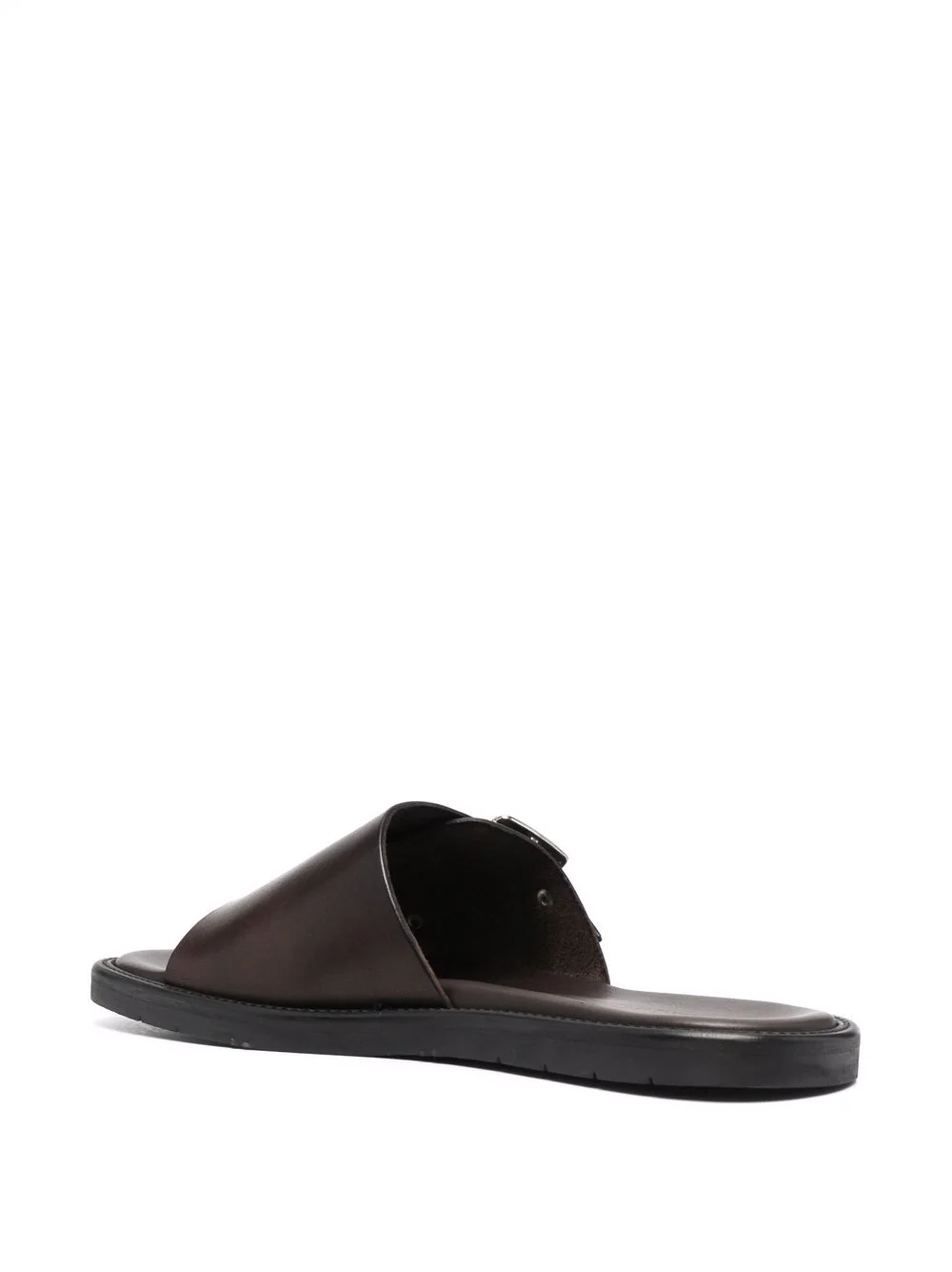Finitions à boucle décorative, ornements argentés, bout ouvert, semelle intérieure griffée, semelle plate en caoutchouc. Matière : cuir de veau.