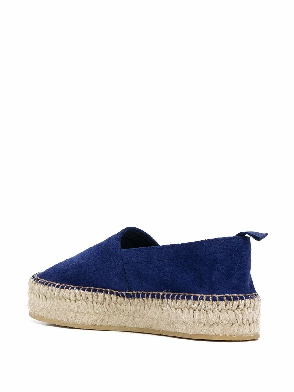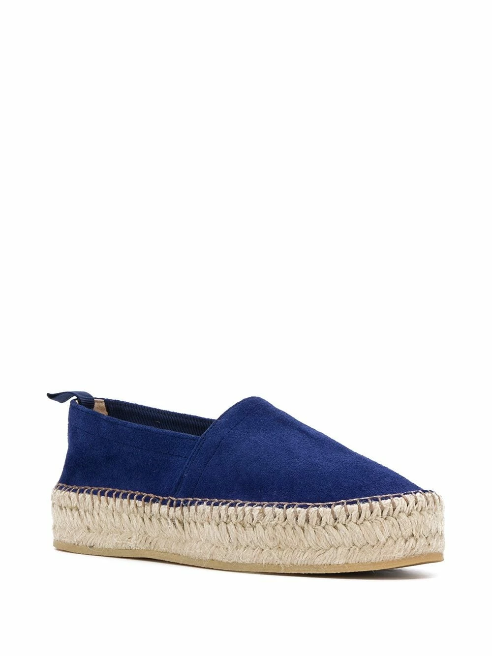 Design à enfiler, bout rond, semelle en raphia tressé. Couleur : bleu. Matière : daim.