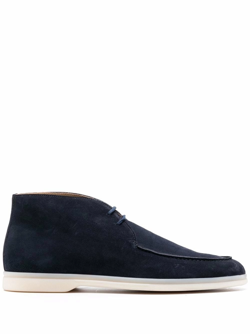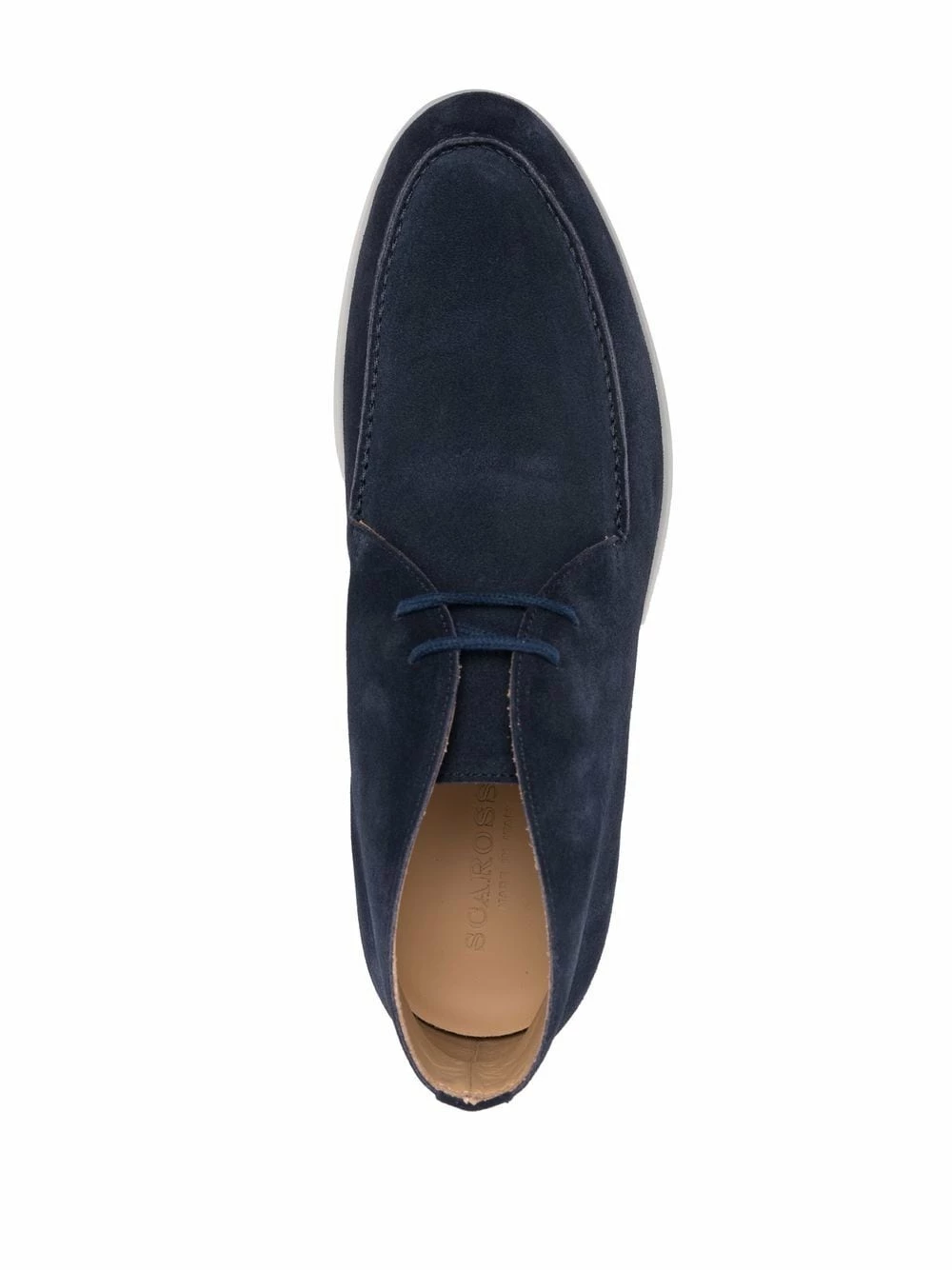 Fermeture à lacer sur le devant, hauteur cheville, bout rond, semelle plate en caoutchouc. Couleur : bleu. Matière : daim.