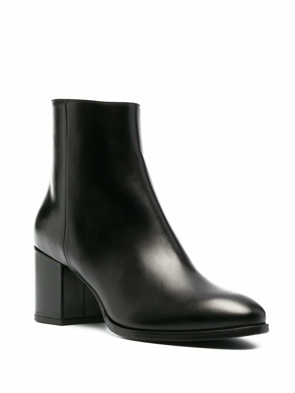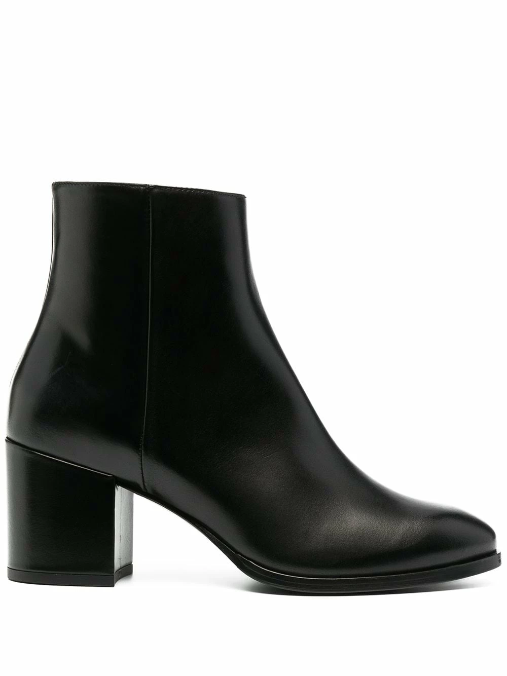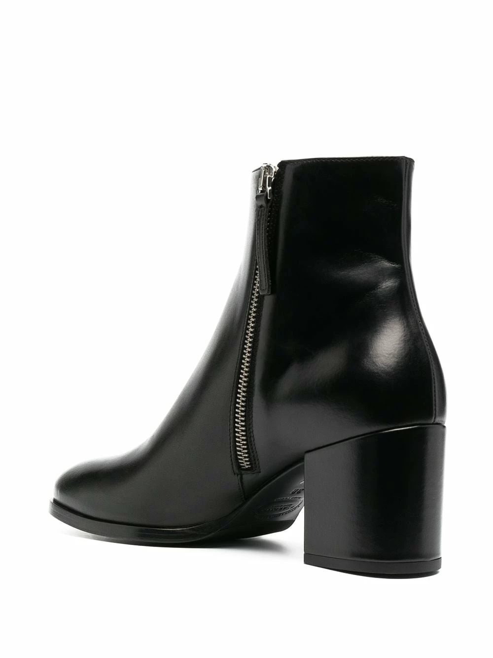 Design ton sur ton, fini poli, longueur cheville, bout rond, fermeture zippée sur le côté, talon mi-haut épais. Couleur : noir. Matière : cuir.
