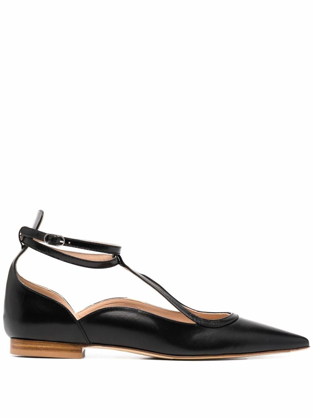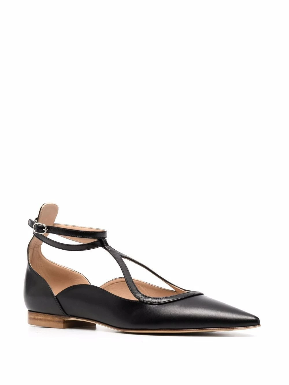 Détail de brides croisées, fermeture à boucles sur les côtés, bout pointu, semelle plate en cuir, semelle intérieure à logo. Couleur : noir. Matière : cuir.