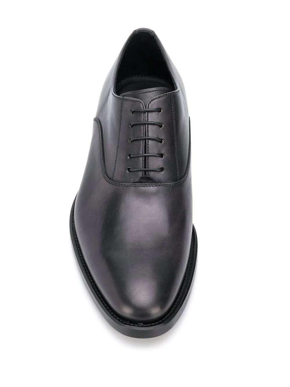 Derbies classiques en cuir de veau Scarosso avec bout en amande, fermeture à lacer sur le devant, empiècements à coutures visibles, semelle intérieure à logo et semelle en cuir. Couleur : noir.