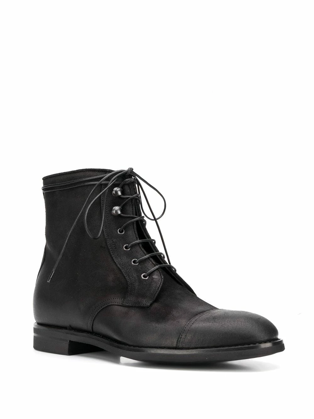 Bottines Paolo en daim Scarosso avec bout en amande, laçage sur le devant, semelle plate et petit talon. Couleur : noir.