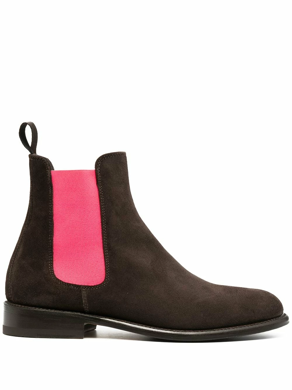Languette d’enfilage au talon, empiècements élastiqués sur les côtés, bout rond, semelle plate en caoutchouc. Couleur : marron. Matière : cuir.
