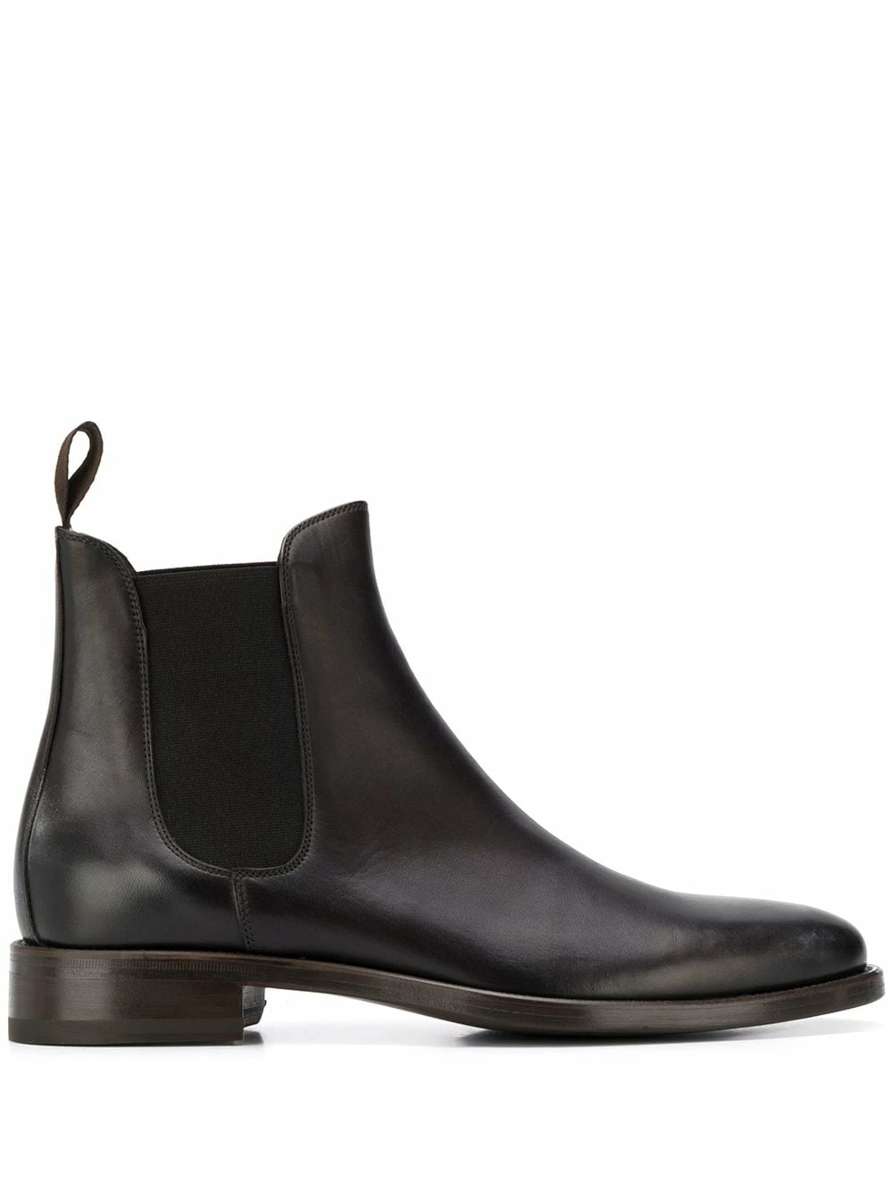 Bottines chelsea classiques en cuirs Scarosso avec languette arrière, empiècements élastiqués sur les côtés, petit talon et bout pointu. Couleur : noir.