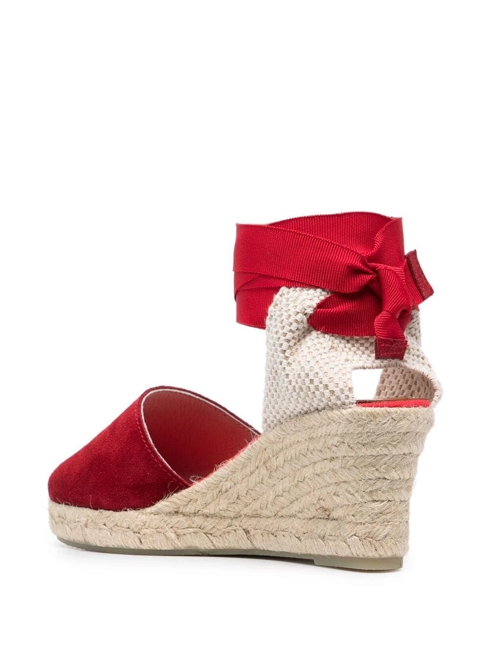 Talon compensé en raphia tressé, bride cheville à nouer, bout rond, semelle intérieure à logo. Couleur : rouge. Matière : daim.