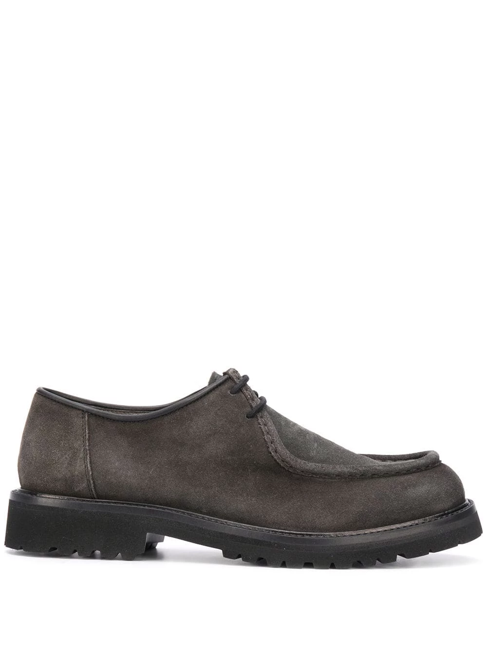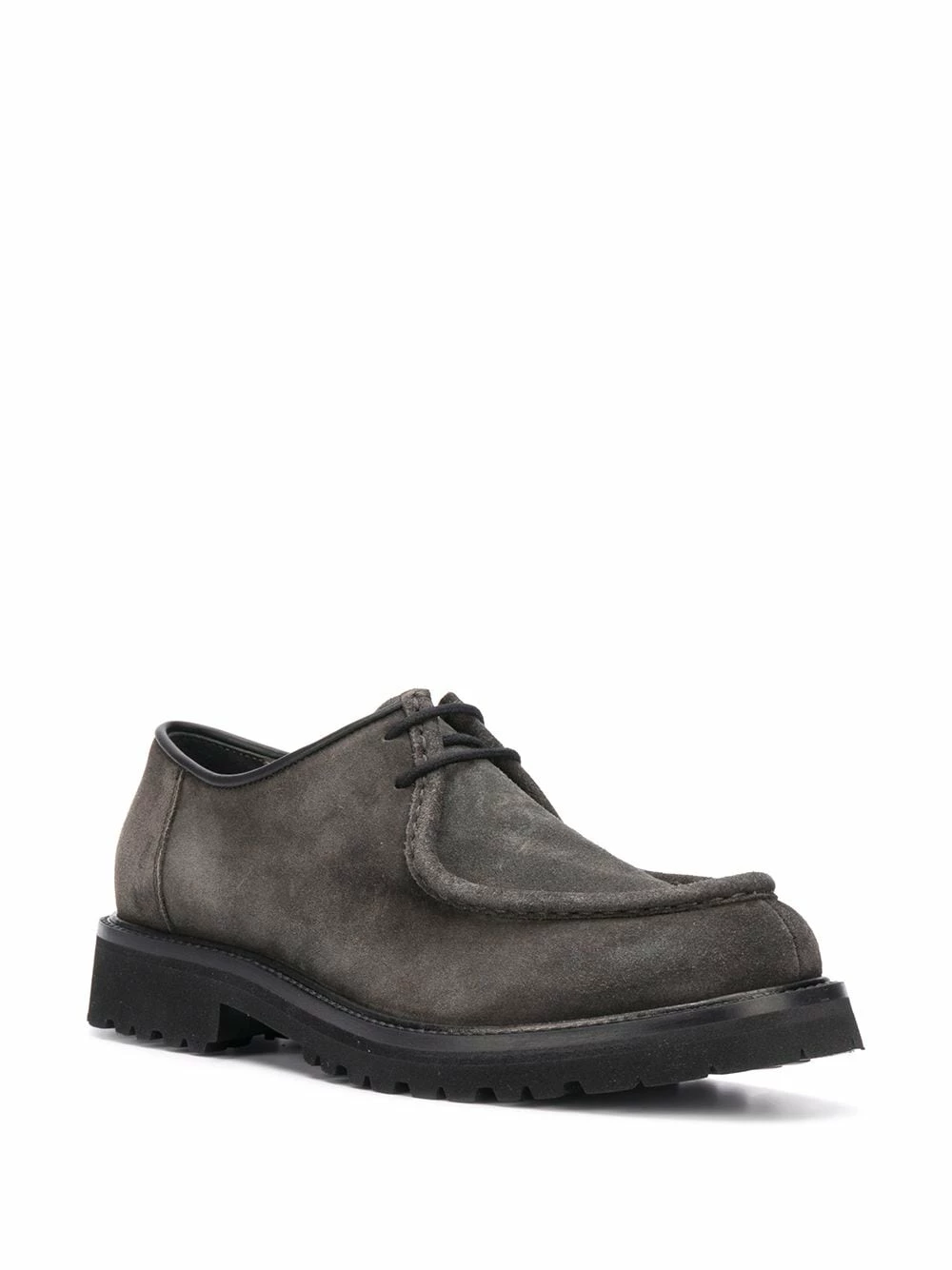Coutures ton sur ton, bout en amande, fermeture à lacer sur le devant, petit talon épais. Matière : daim.